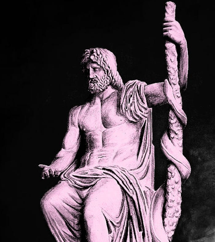 “Asclepius derived his name from healing and from deferring the withering that comes with death. For this reason, a serpent is given as his attribute, indicating that those who avail themselves of medical science undergo a process similar to the serpent, growing young again after illness and sloughing off old age.”